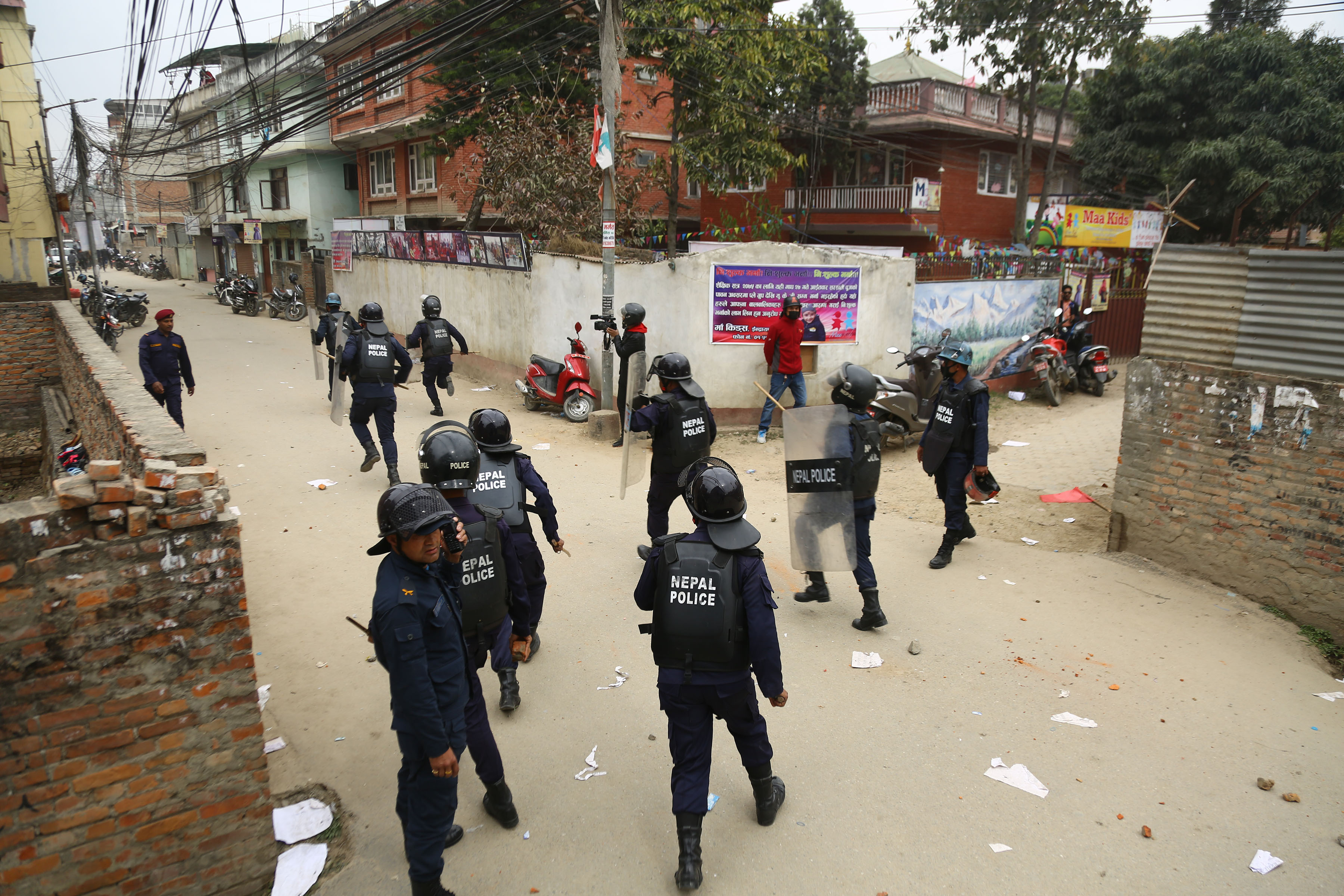 नेपाली काँग्रेस पार्टी केन्द्रीय कार्यालय सानेपामा आइतबार नेविसंघको विवाद विरोध कार्यक्रममा खटिएका सुरक्षाकर्मी । तस्बिर रोशन सापकोटा, रासस